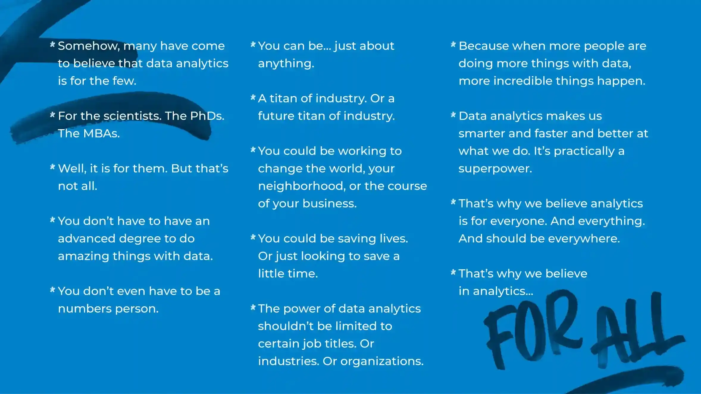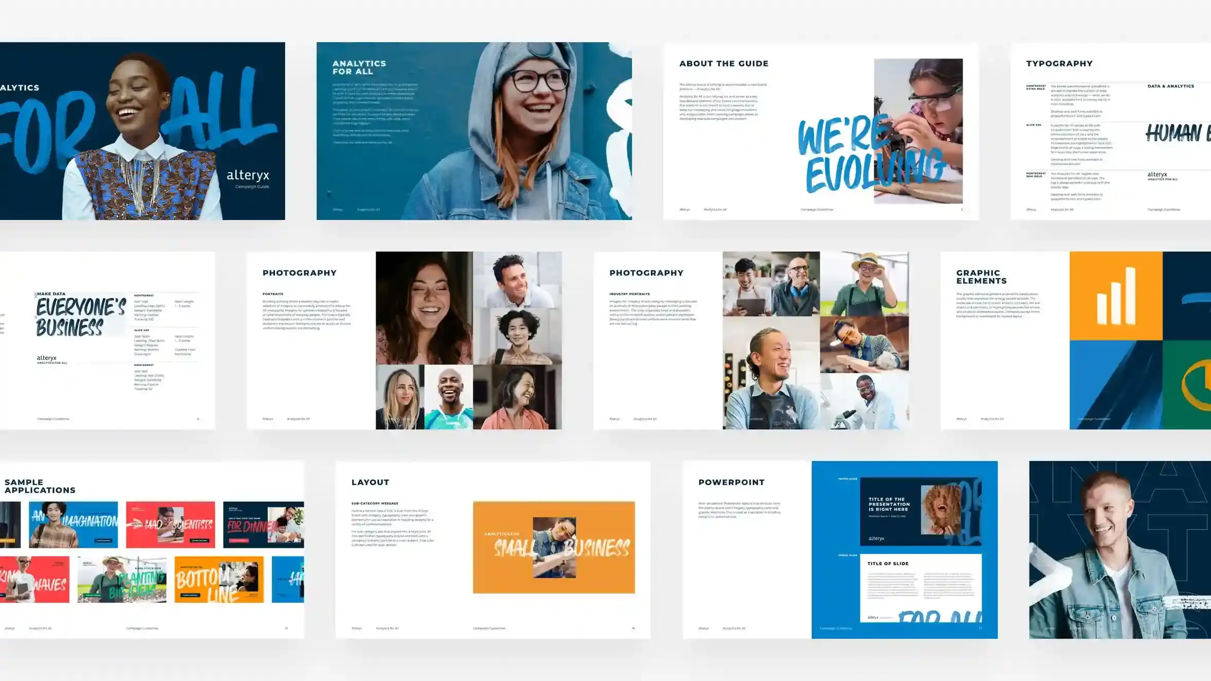 We worked closely with the marketing team and internal agency to hone in on the idea that Alteryx provides Analytics for All – a more human, ebullient, and decidedly less corporate brand expression. A human, script-like font counterbalances more technical subject matter while cementing ideas of user empowerment and democratization. Candid imagery – real people in moments of real work – showcased the tangible business improvements made possible by access to data. The campaign manifesto reinforced that Alteryx means data for world changers; it’s data that gets you.