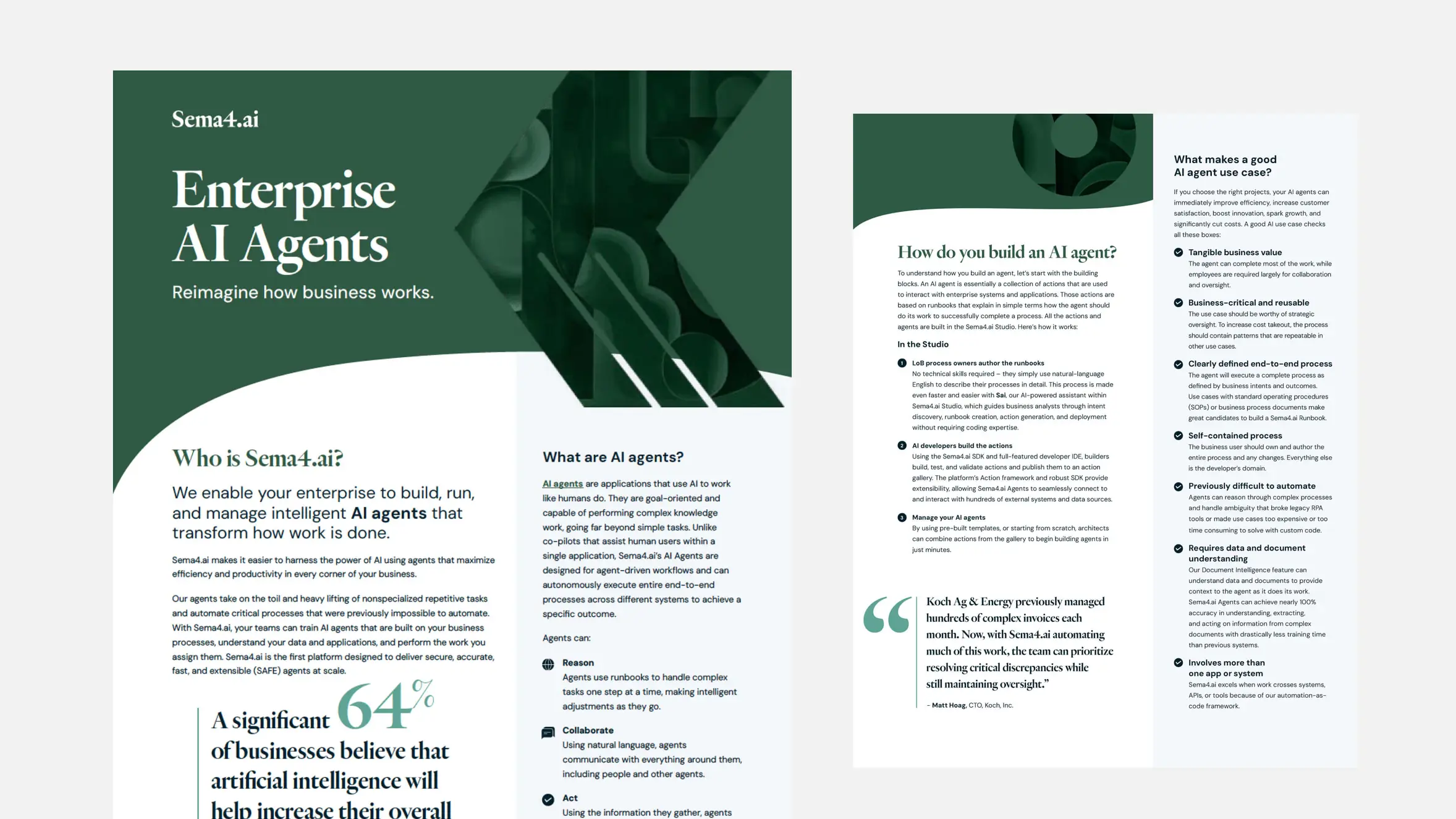 The new brand and website launched within weeks, with ongoing refinement to support real-time growth. Sales and collateral templates were deployed in parallel while helping them brand new offices as they scale internal operations, all through a focused, collaborative process designed to bring Sema4.ai quickly to market.